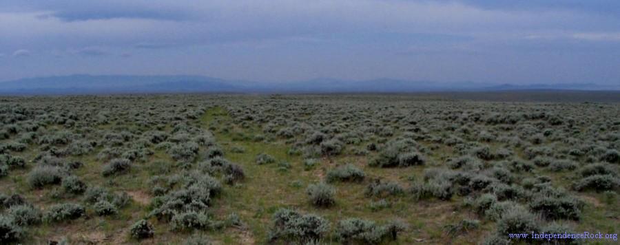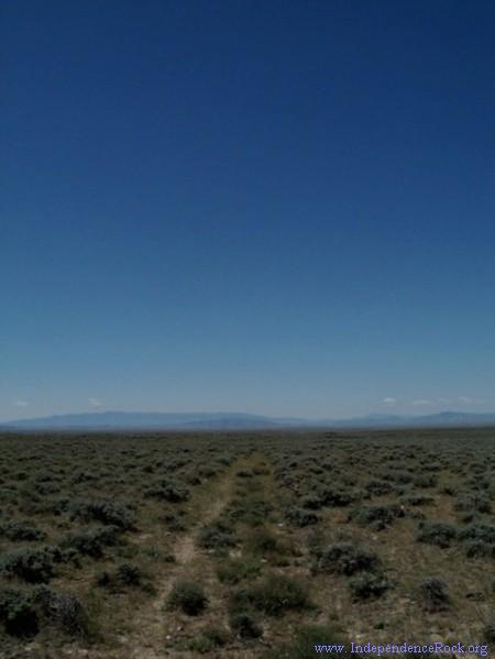From Willow Spring the trail climbs what is now called Ryan Hill. Pioneers called it Prospect Hill, for from the summit one could view the mountain country just ahead at the Sweetwater River. The ruts of the original trail are clearly visible here at the hill's summit (see the satelite image on the MSR Maps link below). A short detour off the Oregon Trail Road leads to a BLM exhibit at the ruts.