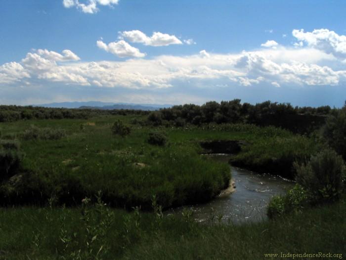 The trail crosses Horse Creek (then called Greasewood Creek) at its confluence with Fish Creek. It was here on Greasewood Creek in late October of 1856 that the Martin handcart company finally met the six supply wagons sent to help them. The supplies distributed were meager when spread among the group of nearly 500, but was enough to keep them moving.