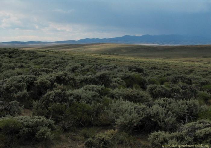 Surprisingly, South Pass is not the highest point on the trail. This spot, between the crossings of Strawberry Creek and Rock Creek, is nearly 100 feet higher, at an elevation just below 7500 feet. The Windriver Mountains form an imposing wall on the west horizon.