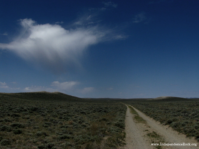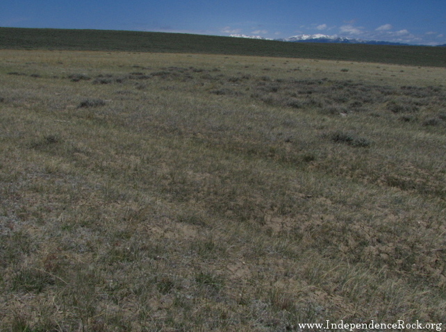 He was describing this spot, where two mounds of desert earth stand on either side of the trail, forming a gateway. The two mounds are not high at all, but in the gently rolling terrain here near South Pass, they do stand out. Just through this gate, within sight of (and essentially the same