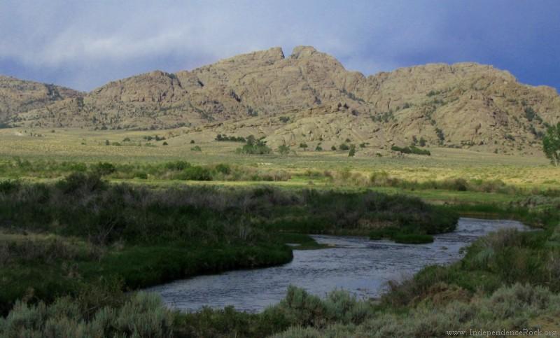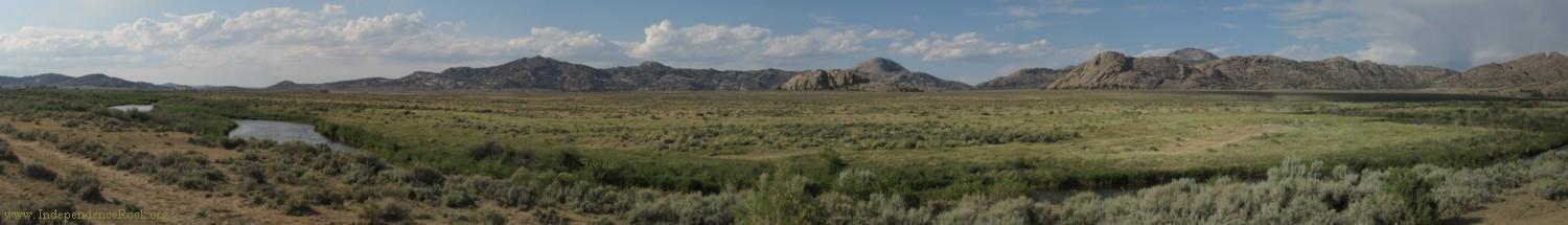 Upstream from Split Rock the Sweetwater Valley takes on a different character. The large domes of the Granite Mountains give way to the smaller "Rattlesnake hills", and the valley floor has more uninterrupted sage brush flats. But the profile of Split Rock is just as much a feature to the west as it was to the east.